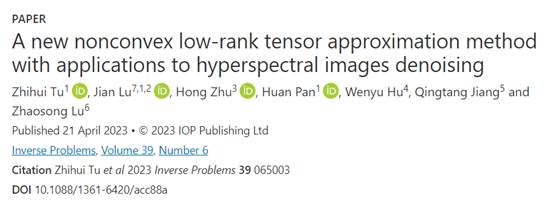 数学与智能信息处理团队涂志辉博士生、鲁坚教授与江苏大学朱红副教授、赣南师范大学胡文玉教授、密苏里大学圣路易斯分校蒋庆堂教授、明尼苏达大学双城分校吕召松教授合作的学术论文“A new nonconvex low-rank tensor approximation method with applications to hyperspectral images denoising”。
