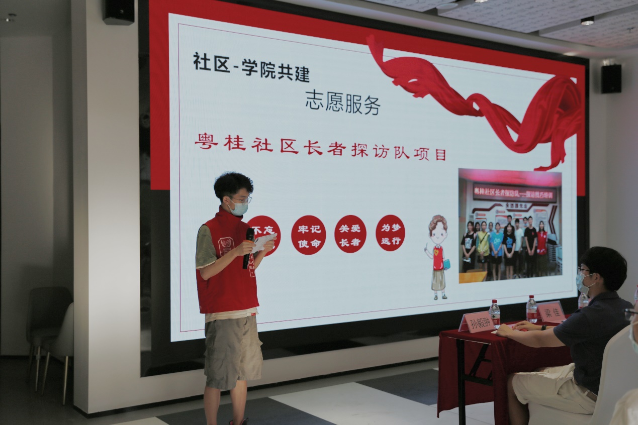 随后,主持人介绍粤桂社区长者探访队的建立背景、基本情况以及建立目标。探访队的建立背景:粤桂与深大、滨海片区协间发展,形成联动,实现校区、社区、园区资源共享。粤桂社区长者探访队就是校区与社区资源共享联动很好的实例,粤桂社区有高龄长者,深大数院有优质的志愿者资源,推动邻里友善、关爱社区长者,营造良好的敬老爱老社区氛围。探访队共治共建单位由数学与统计学院、粤桂社区、春暖社工组成。项目目标是希望长者接受到探访服务,学生社会实践得到提升,形成社区关爱,营造同是一家人的社区氛围。