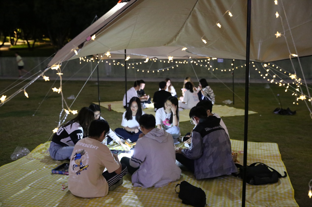 活动一直持续到21:30,大家的兴致和热情依然如初。然而天下无不散之筵席,这次团学凝聚力活动迎来尾声。大家齐心协力整理卡牌、帐篷、野餐垫等,仔细检查确保现场没有任何垃圾遗留,最后满载着愉悦的心情离开草坪。
