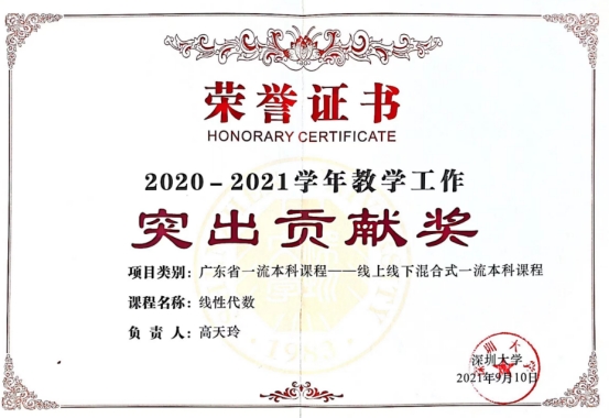 《线性代数》于2020年认定为广东省一流线上线下混合式课程。2015年起,团队尝试将“微视频”与传统课堂相结合,2016年左右着手准备线性代数MOOC课程的线上建设工作。2018年,由高天玲老师主讲线性代数MOOC在优课平台上线。2019年开始,团队开始线上线下混合式教学改革,到目前已形成了适合本校特点的线性代数线上线下混合式教学模式。近年来,课程负责人高天玲老师和教学团队李国老师、张维强老师、冯纪强老师逐步开展线上和线下混合课程,多种手段“有序”组织教学,着眼于学生“应用意识”及动手能力的培养,创新课程评价体系,实行“过程性”考核和“教考分离”。