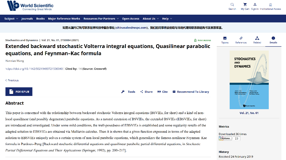 王寒霄助理教授独立完成的论文《Extended Backward Stochastic Volterra Integral Equations, Quasilinear Parabolic Equations, and Feynman-Kac Formula》获得该奖项。SD是随机动力系统与随机分析领域的国际学术期刊,每年只评选4篇年度最佳论文。王寒霄博士是该年度的唯一华人获奖者。