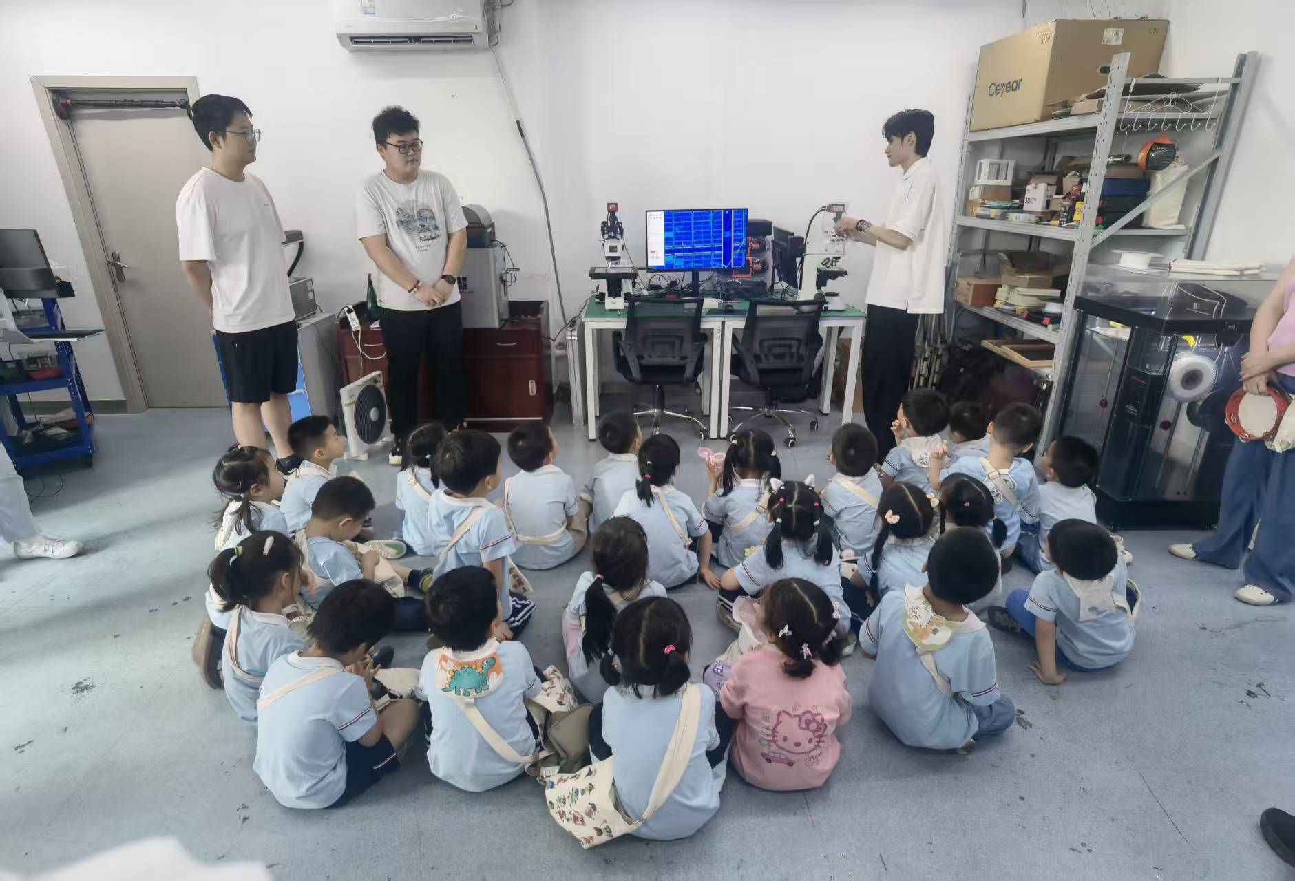 在互动体验环节,孩子们认真观察设备运行、积极举手提问,与大学生哥哥姐姐们亲密交流。神奇的激光刻字和3D打印,显微镜下的微观世界,大家在玩中学、学中思,眼中闪烁着对科学知识的向往。现场气氛热烈,欢声笑语不断,童真与严谨的科研氛围相互交融,构成一幅温暖生动的校园画面。